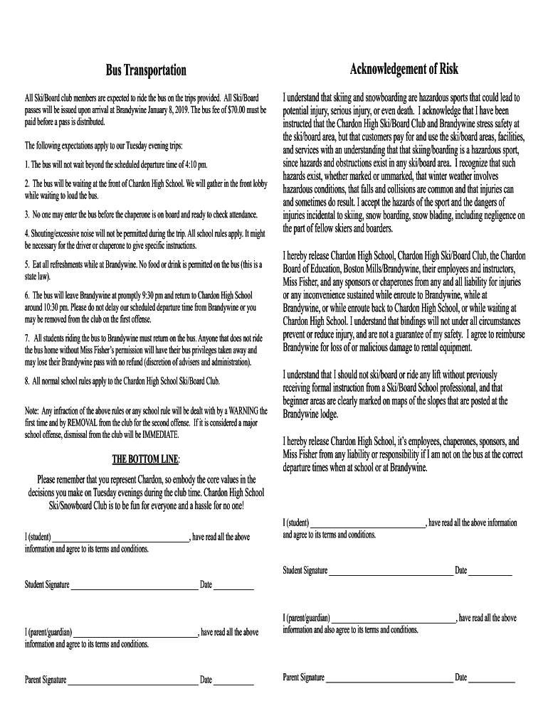 Bus TransportationAcknowledgement of Riskily Ski/Board club members are expected to ride the bus on the trips provided. All Ski/Board