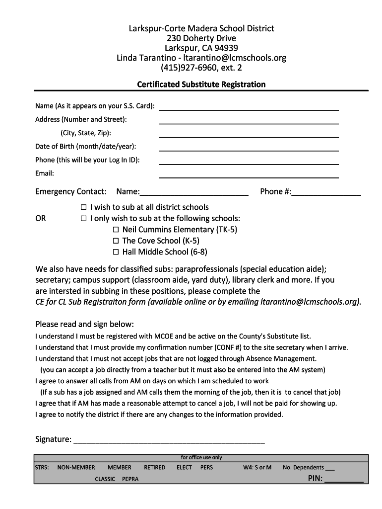 LarkspurCorte Madera School District 230 Doherty Drive Larkspur, CA 94939 Linda Tarantino schools.org (415)9276960, ext. 2 Certificated Substitute Registration Names (As it appears on your S.S. Card):