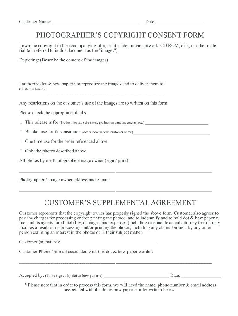 Customer Name: Date: PHOTOGRAPHERS COPYRIGHT CONSENT FORM I own the copyright in the accompanying film, print, slide, movie, artwork, CD-ROM, disk, or other material (all referred to in this document