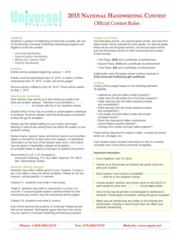 2015 National Handwriting Contest Official Contest Rules Eligibility Students in grades K8 attending schools that currently use one of the following Universal Publishing handwriting programs are eligible