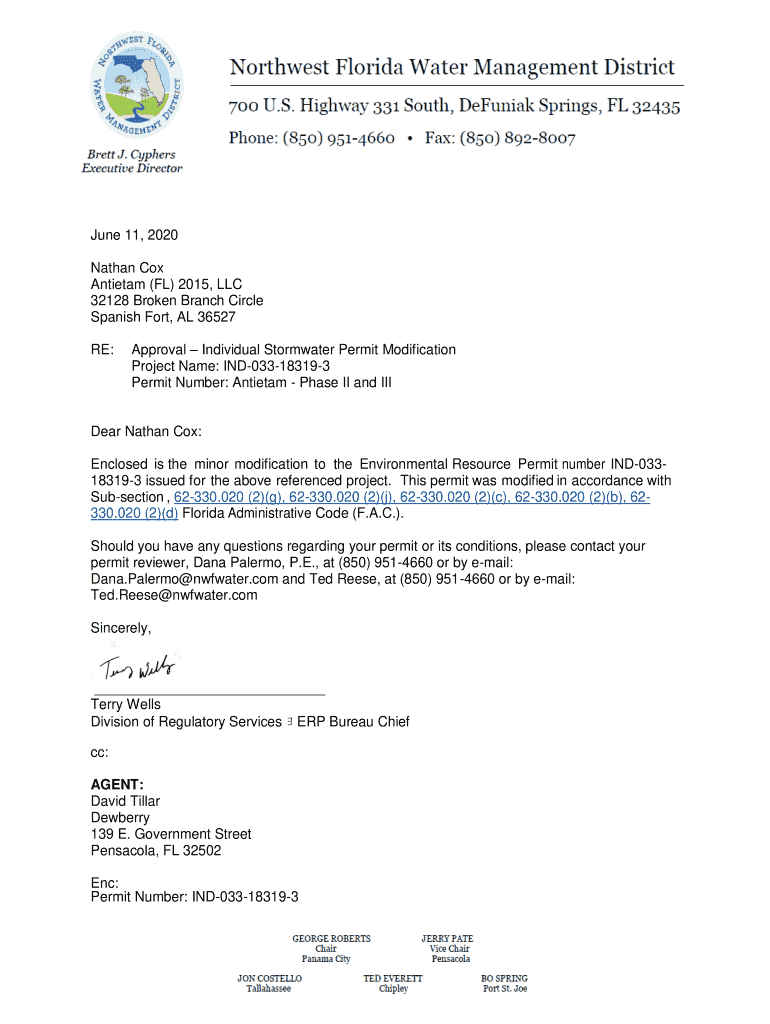 June 11, 2020, Nathan Cox Antietam (FL) 2015, LLC 32128 Broken Branch Circle Spanish Fort, AL 36527 RE:Approval Individual Stormwater Permit Modification Project Name: IND033183193 Permit Number: