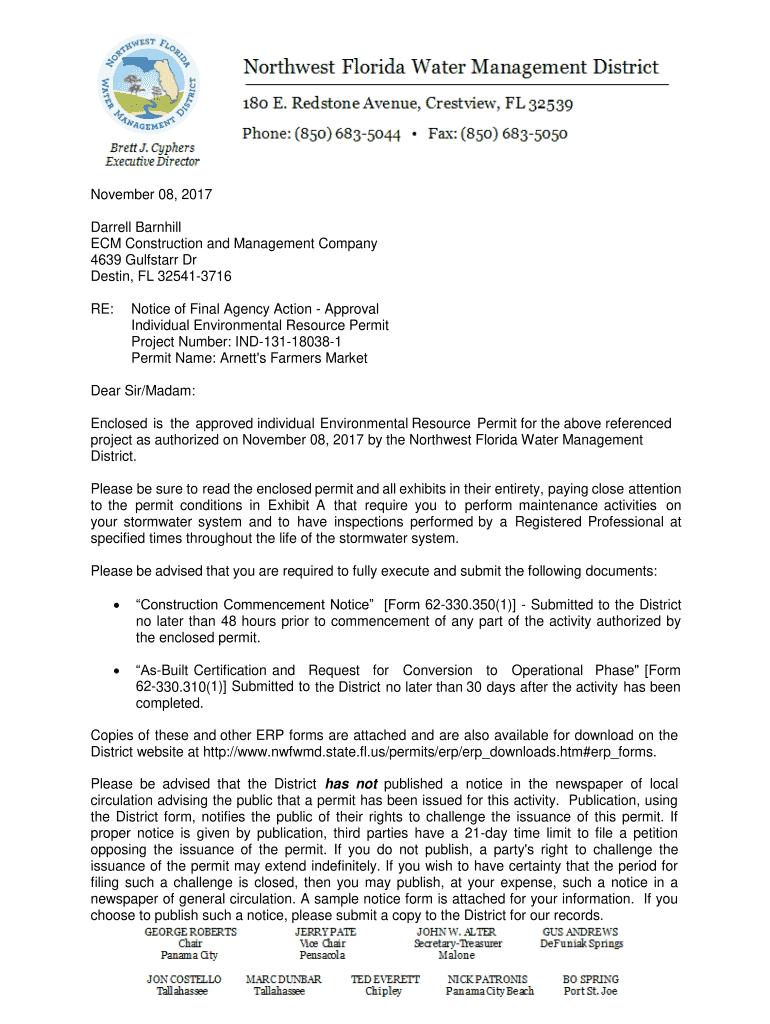 November 08, 2017, Darrell Barn hill ECM Construction and Management Company 4639 Gulfstarr Dr Destiny, FL 325413716 RE:Notice of Final Agency Action Approval Individual Environmental Resource Permit