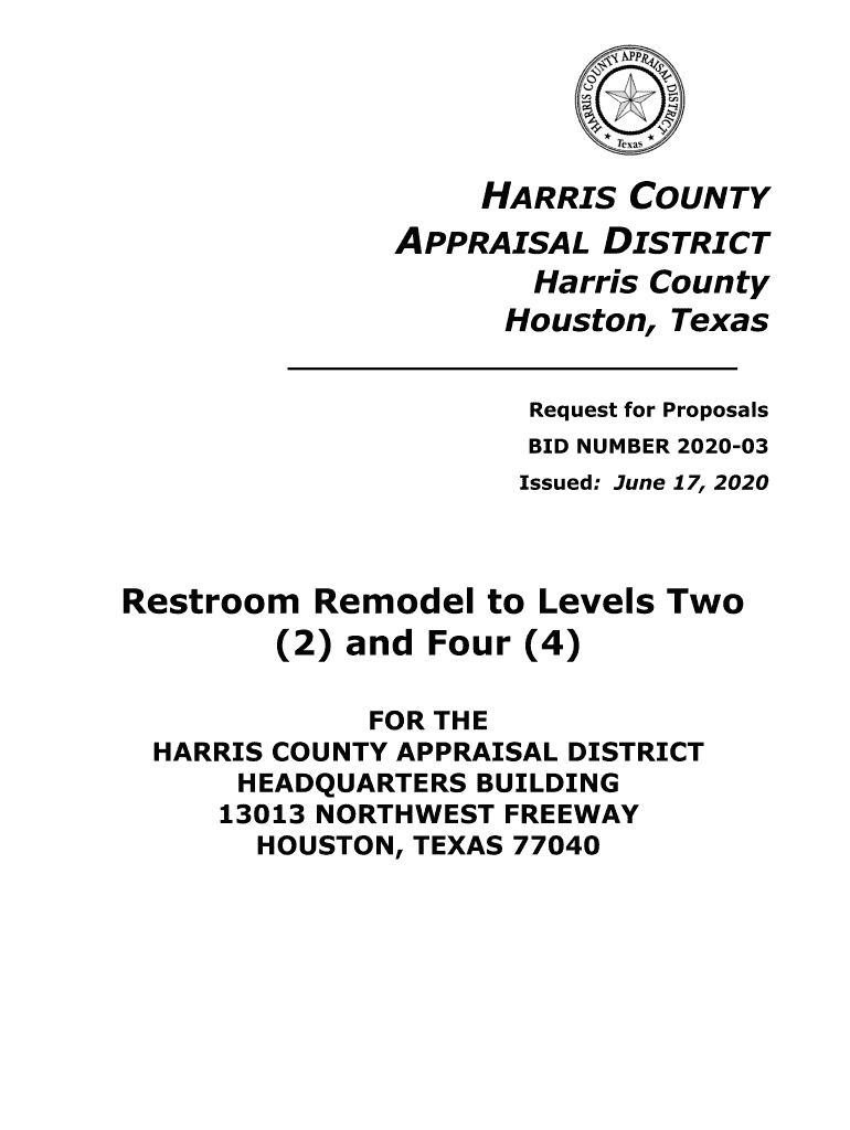 HARRIS COUNTY APPRAISAL DISTRICT Harris County Houston, Texas Request for Proposals BID NUMBER 202003 Issued: June 17, 2020Restroom Remodel to Levels Two (2) and Four (4) FOR THE HARRIS COUNTY APPRAISAL