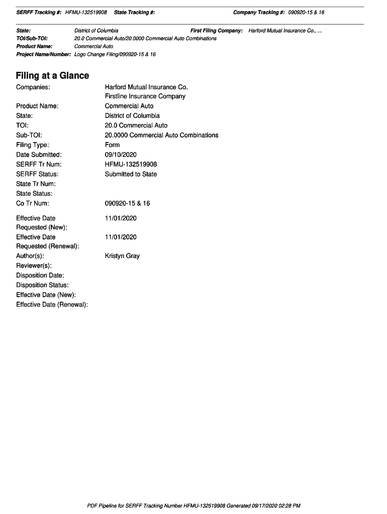SERFS Tracking #: HFMU132519908State Tracking #:Company Tracking #: 09092015 & 16State:District of Columbia/Subtle:20.0 Commercial Auto/20.0000 Commercial Auto CombinationsFirst Filing Company:Product
