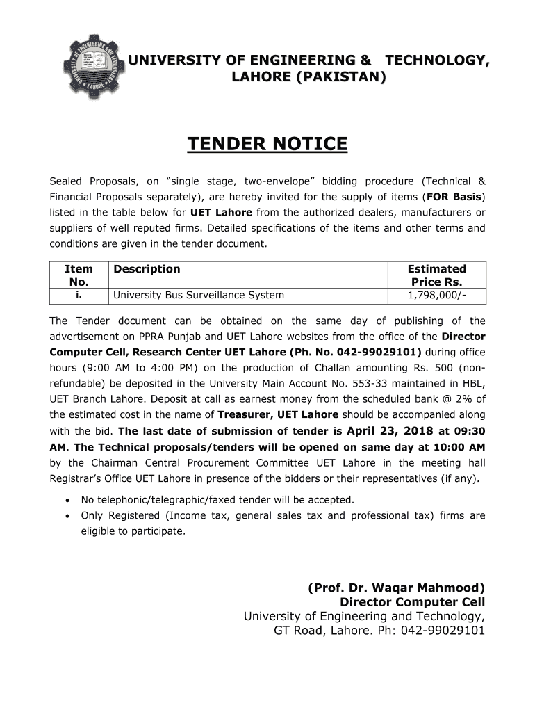 UNIVERSITY OF ENGINEERING & TECHNOLOGY, LAHORE (PAKISTAN)TENDER NOTICE Sealed Proposals, on single stage, two envelope bidding procedure (Technical & Financial Proposals separately), are hereby invited