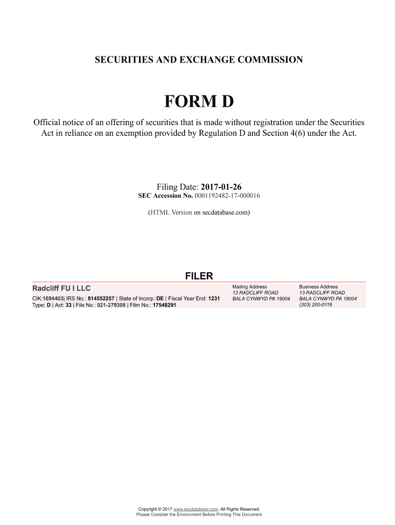 Get the free Radcliff FU I LLC Form D Filed 2017-01-26. Accession Number