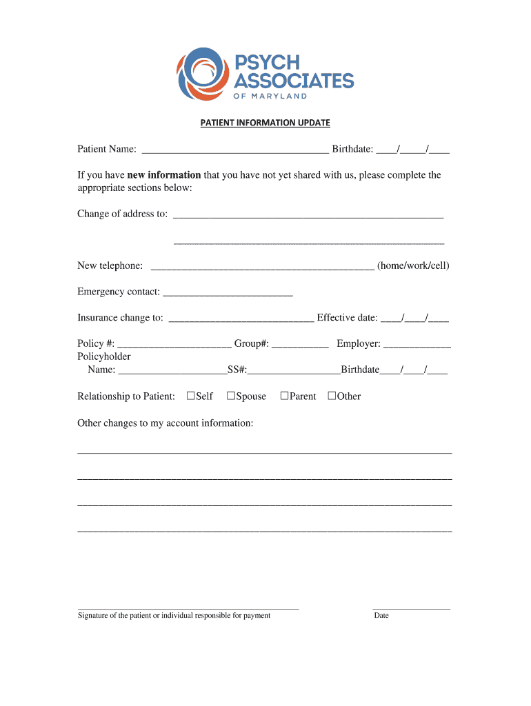 PATIENT INFORMATION UPDATEPatient Name: Birthdate: / / If you have new information that you have not yet shared with us, please complete the appropriate sections below: Change of address to: New telephone:
