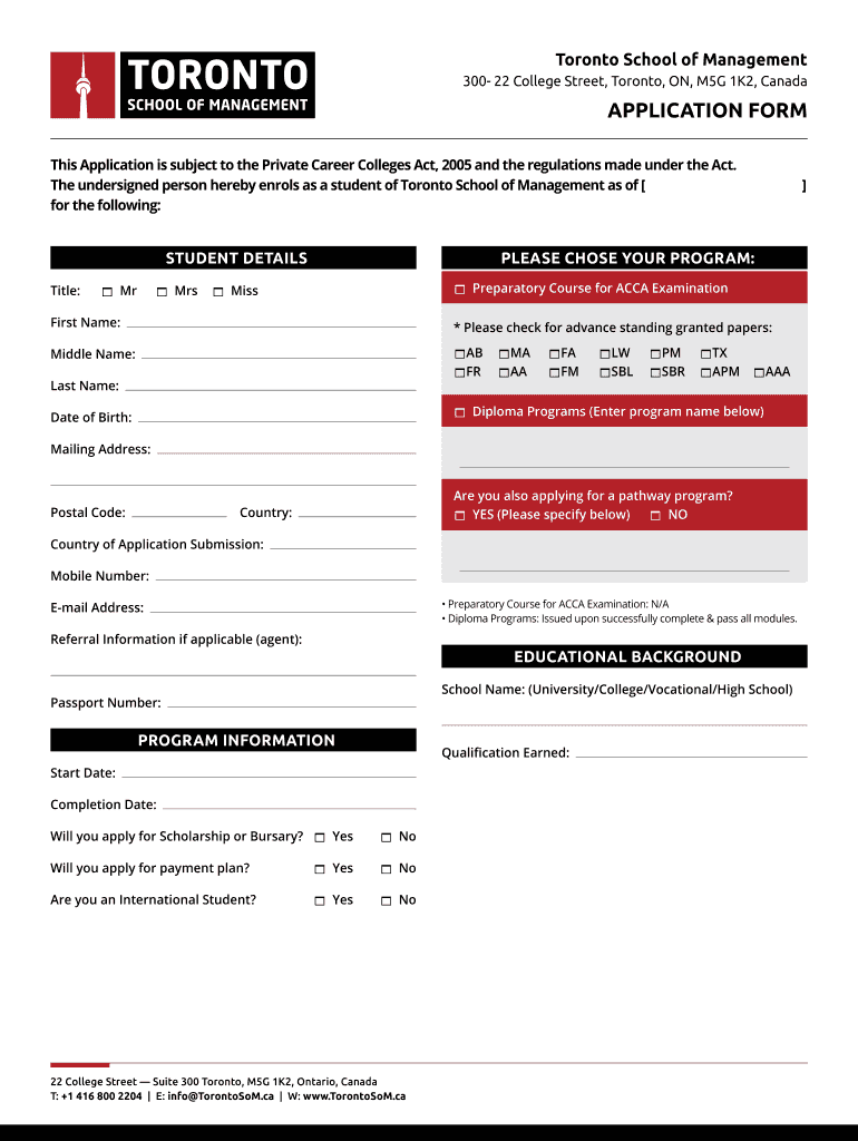 Toronto School of Management 300 22 College Street, Toronto, ON, M5G 1K2, CanadaAPPLICATION FORM This Application is subject to the Private Career Colleges Act, 2005 and the regulations made under