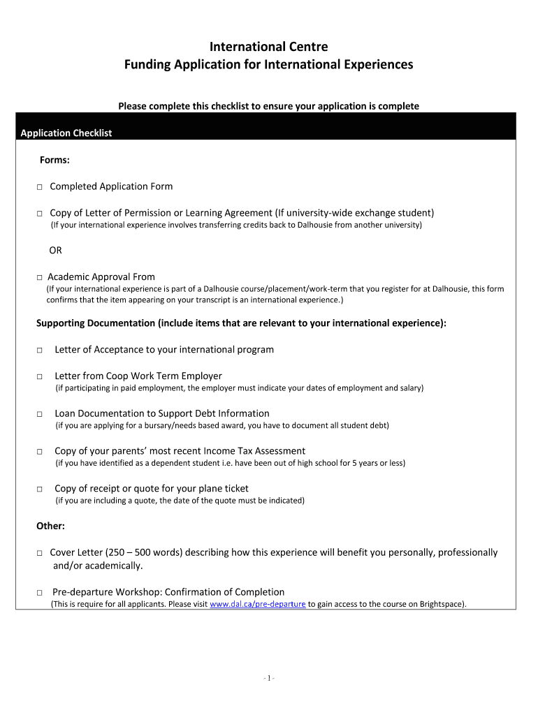 International Center Funding Application for International Experiences Please complete this checklist to ensure your application is complete Application Checklist Forms: Completed Application Form
