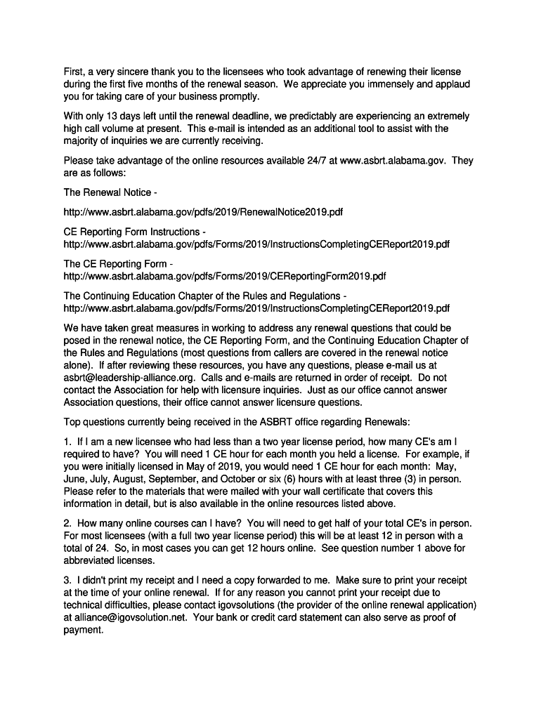 First, a very sincere thank you to the licensees who took advantage of renewing their license