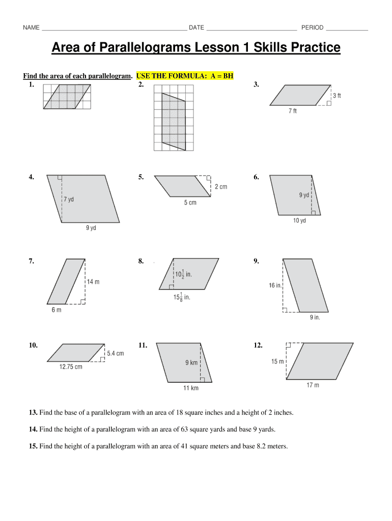 NAME DATE PERIOD Area of Parallelograms Lesson 1 Skills Practice Find the area of each parallelogram. USE THE FORMULA: A BH 1. 2.3.4.5.6.7.8.9.10.11.12.13. Find the base of a parallelogram with an