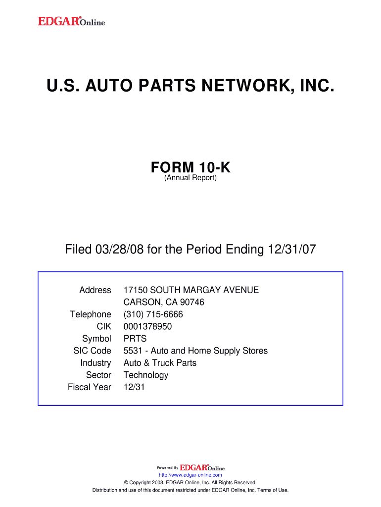 U.S. AUTO PARTS NETWORK, INC.FORM 10K (Annual Report)Filed 03/28/08 for the Period Ending 12/31/07 Address Telephone CIK Symbol SIC Code Industry Sector Fiscal Year17150 SOUTH MARY AVENUE CARSON,