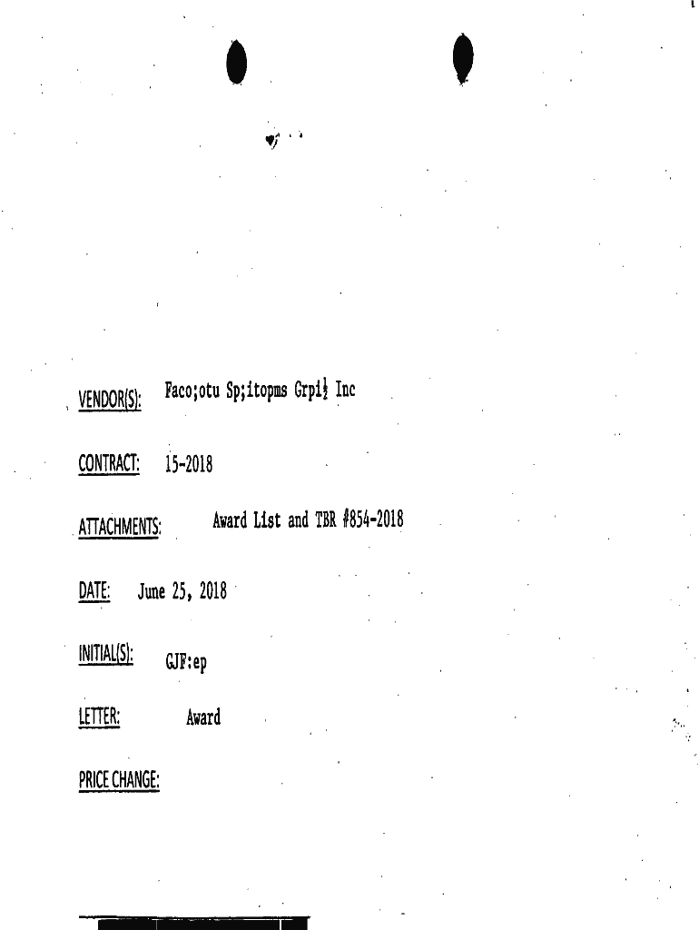 VENDOR(S):Face;OTU Sp;items Grip Contract:152018Award List and TAR 1/8542018ATTACHMENTS: DATE:June 25, 2018INITIAL(S): LETTER: PRICE CHANGE:GDF: EP AwardaElaine Peterson C#lS2018 Maintenance of Incandescent
