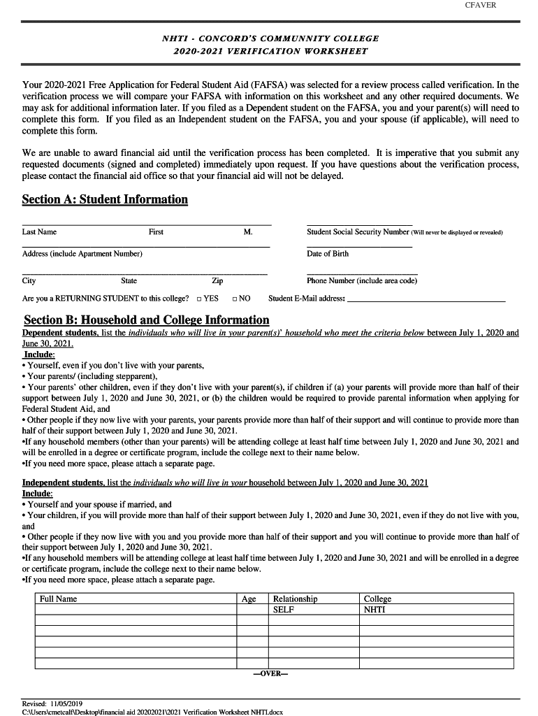 CAVERN TI C O NC O RD S C O MM U N NI T Y C O L EG E 2 0 2 0 2 0 2 1 VE RIF IC A T IO N W O OK SH E Your 20202021 Free Application for Federal Student Aid (FAFSA) was selected for a review process