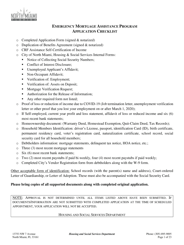 EMERGENCY MORTGAGE ASSISTANCE PROGRAM APPLICATION CHECKLIST o o o OO o OO o o o completed Application Form (signed & notarized) Duplication of Benefits Agreement (signed & notarized) CRF Assistance