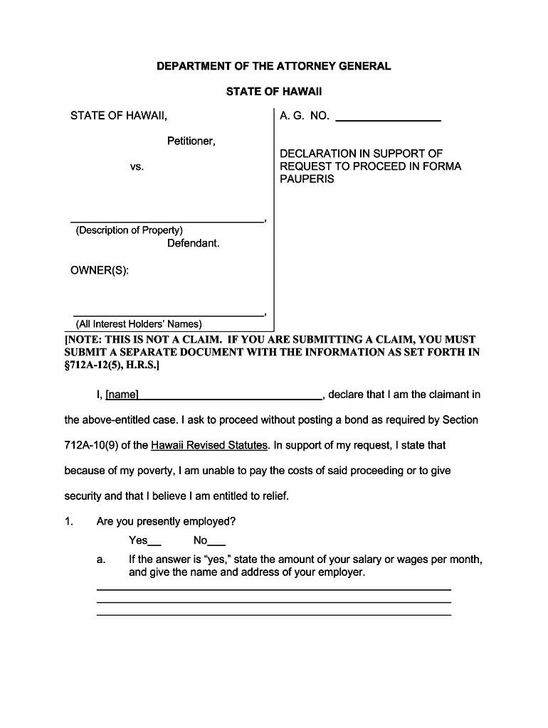 DEPARTMENT OF THE ATTORNEY GENERAL STATE OF HAWAII A. G. NO.STATE OF HAWAII, Petitioner, DECLARATION IN SUPPORT OF REQUEST TO PROCEED IN FORM Pauperism., (Description of Property)Defendant. OWNER(S):,