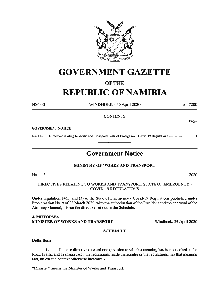 GOVERNMENT GAZETTE OF REPUBLIC OF NAMIBIA N$6.00WINDHOEK 30 April 2020No. 7200CONTENTSPageGOVERNMENT NOTICE No. 113Directives relating to Works and Transport: State of Emergency COVID-19 Regulations