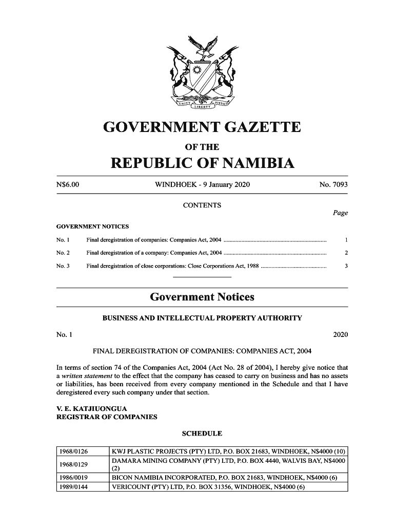GOVERNMENT GAZETTE OF REPUBLIC OF NAMIBIA N$6.00WINDHOEK 9 January 2020CONTENTSNo. 7093PageGOVERNMENT NOTICES No. 1Final deregistration of companies: Companies Act, 2004 ......................................................................1No.