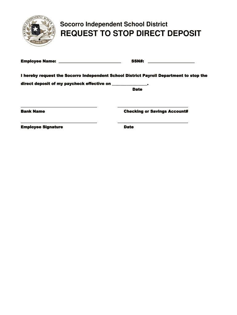 Socorro Independent School DistrictREQUEST TO STOP DIRECT DEPOSITEmployee Name: SSN#: I hereby request the Socorro Independent School District Payroll Department to stop the direct deposit of my paycheck