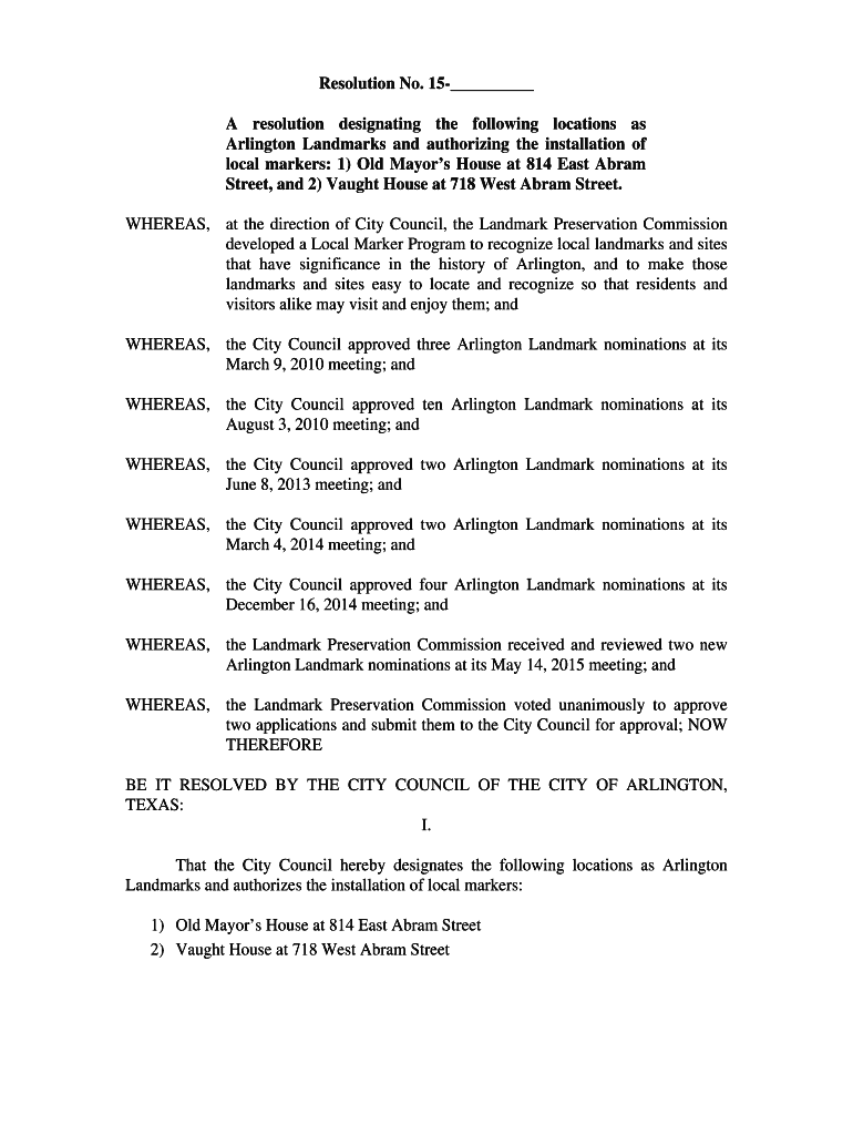 Resolution No. 15 A resolution designating the following locations as Arlington Landmarks and authorizing the installation of local markers: 1) Old Mayors House at 814 East Abram Street, and 2) Vaught