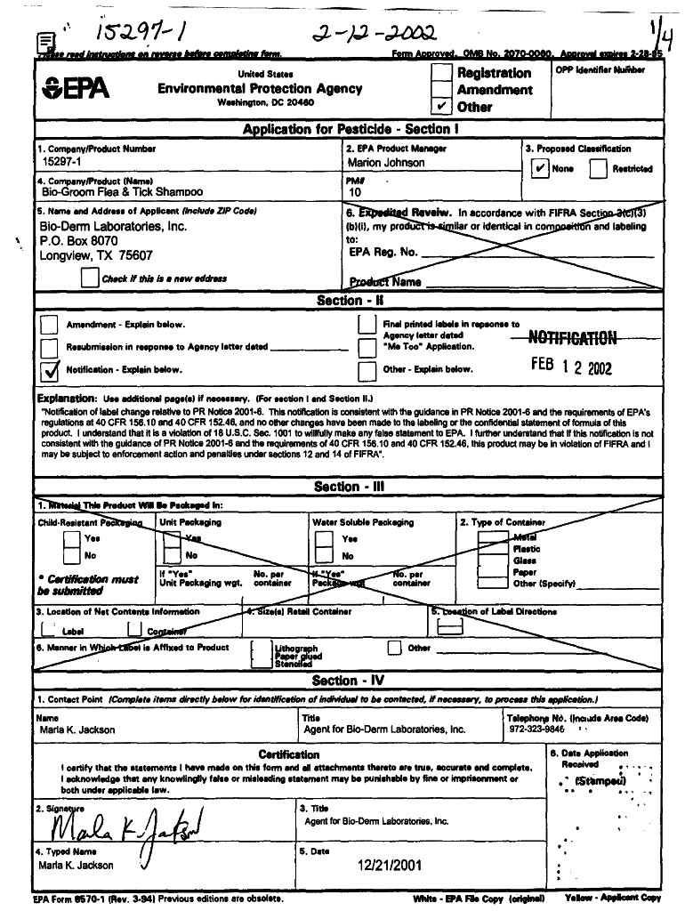 . '. '/ ;. ...,Isq1, ', FftnnUnited State.oEPApEnvironmental Protection Agency Wei. Hinton, DC 204600 '. . Qom NFT.OPP Identifier N registration Amendment Other0/Application for Pesticide Section
