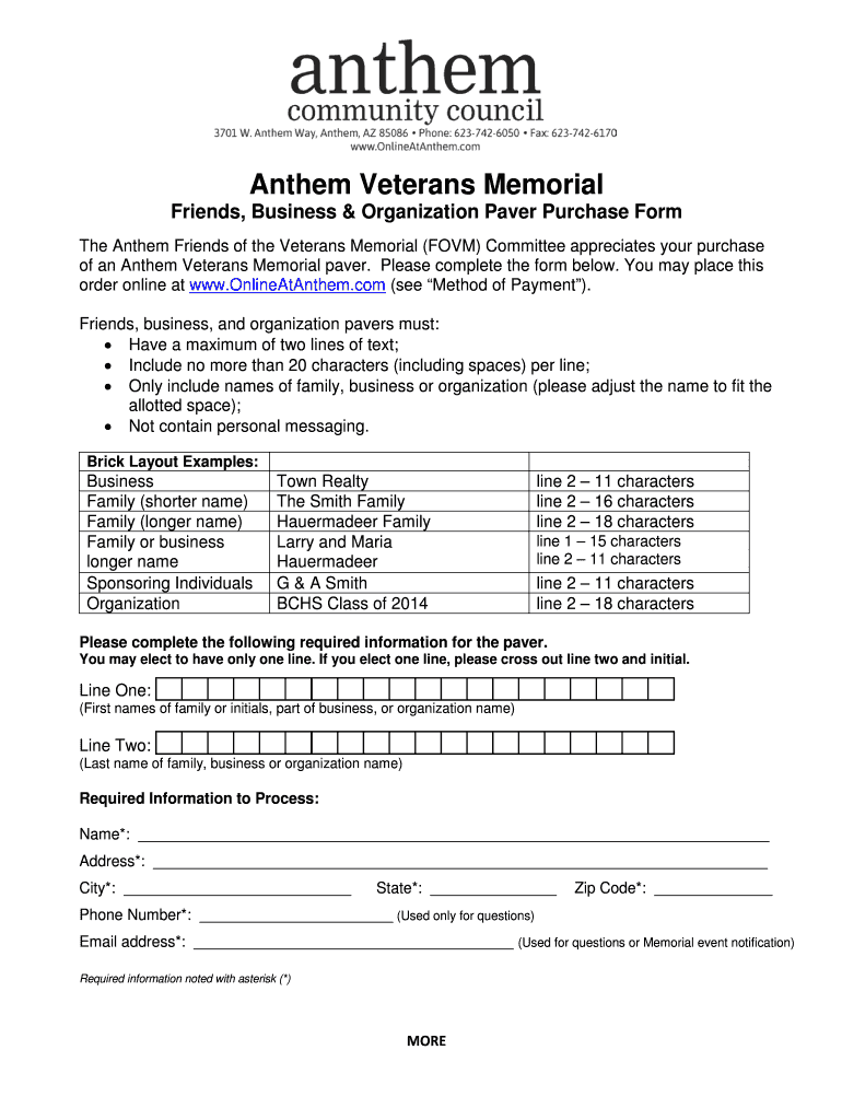 Anthem Veterans Memorial Friends, Business & Organization Paver Purchase Form The Anthem Friends of the Veterans Memorial (FORM) Committee appreciates your purchase of an Anthem Veterans Memorial