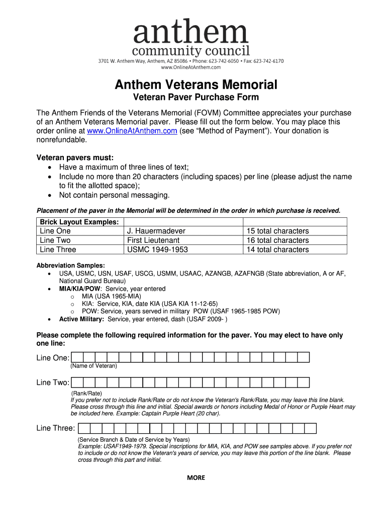Anthem Veterans Memorial Veteran Paver Purchase Form The Anthem Friends of the Veterans Memorial (FORM) Committee appreciates your purchase of an Anthem Veterans Memorial paver. Please fill out the