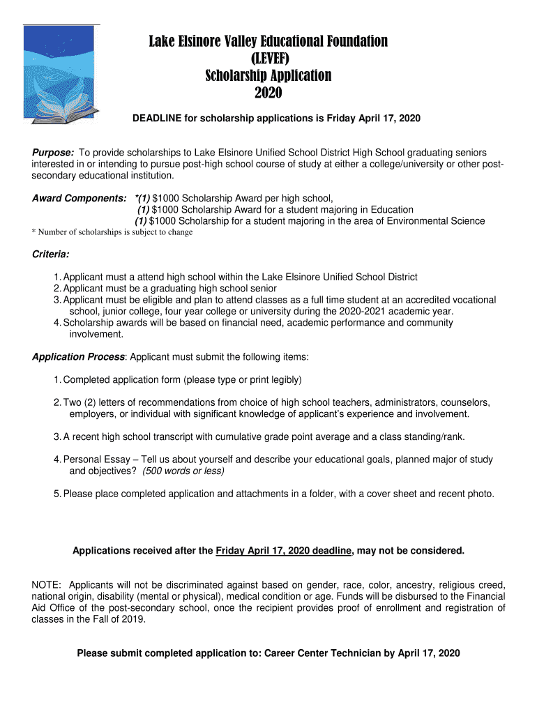 DEADLINE for scholarship applications is Friday, April 17, 2020Purpose: To provide scholarships to Lake Elsinore Unified