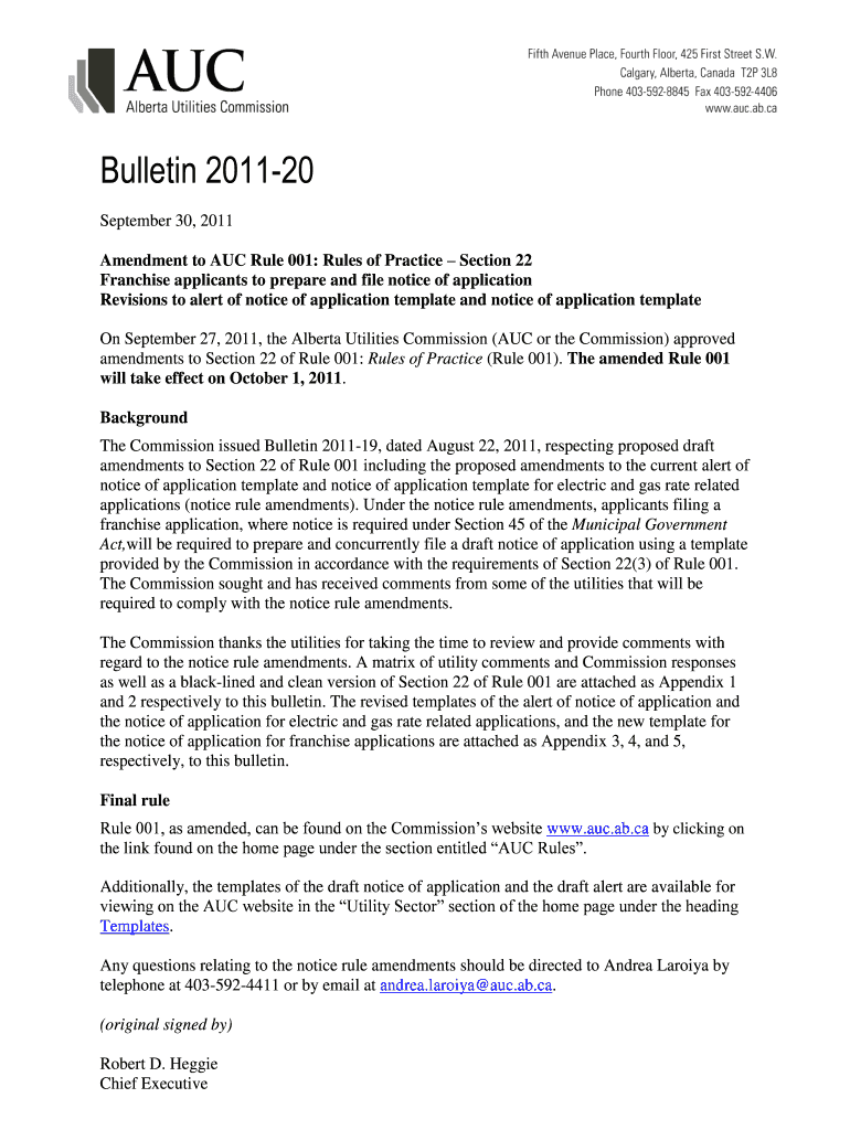 Bulletin 2011-20 September 30, 2011, Amendment to AUC Rule 001: Rules of Practice Section 22 Franchise applicants to prepare and file notice of application Revisions to alert of notice of application