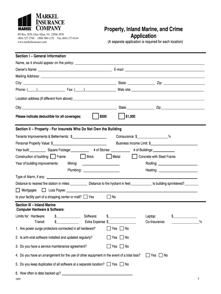 The Property Inland Marine Crime Application is a business insurance form used by companies to apply for coverage related to property, inland marine, and crime protection.