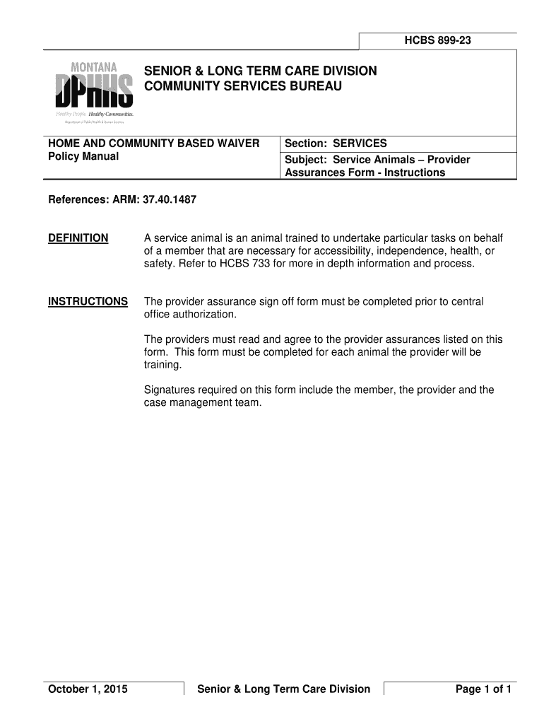 HUBS 89923SENIOR & LONG TERM CARE DIVISION COMMUNITY SERVICES BUREAUHOME AND COMMUNITY BASED WAIVER Policy ManualSection: SERVICES Subject: Service Animals Provider Assurances Form InstructionsReferences: