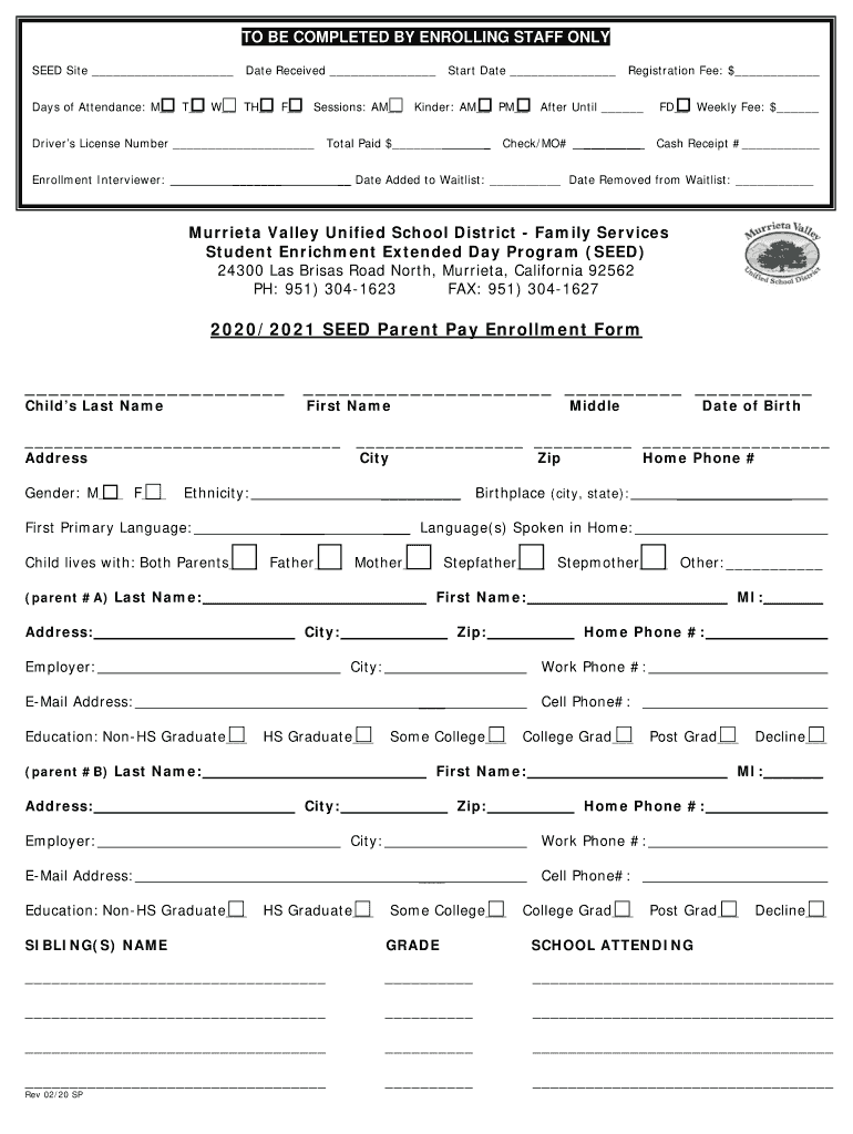 Murrieta Valley Unified School District Family Services2020/2021Student Enrichment and Extended Day (SEED) TK/K 5th grade Parent Pay Enrollment Packet24300 Las Brisks Road North, Murrieta CA 92562