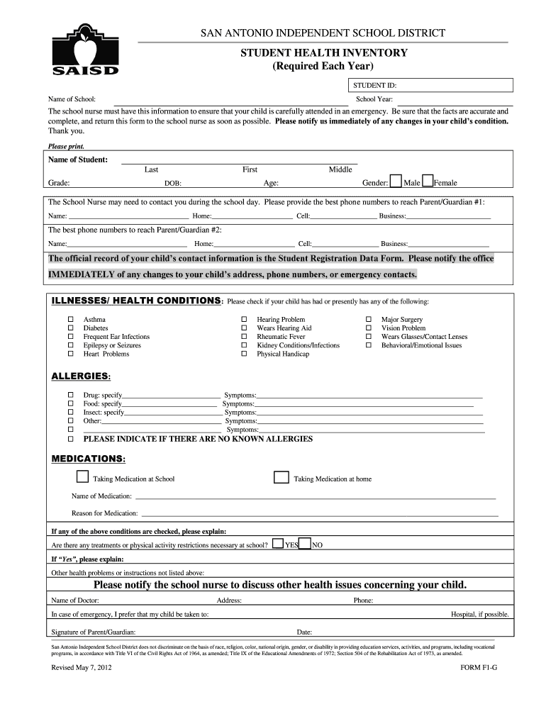 The Student Health Inventory Form is a medical consent document used by the San Antonio Independent School District to collect crucial health information about students.