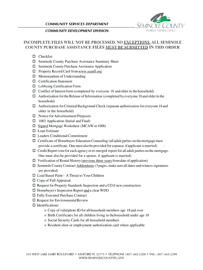 INCOMPLETE FILES WILL NOT BE PROCESSED. NO EXCEPTIONS. ALL SEMINOLE COUNTY PURCHASE ASSISTANCE FILES MUST BE SUBMITTED IN THIS ORDER Checklist Seminole County Purchase Assistance Summary Sheet Seminole
