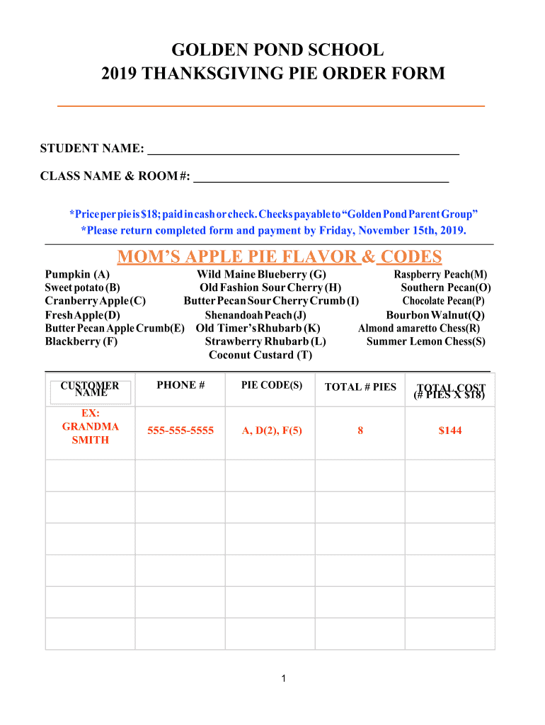 GOLDEN POND SCHOOL 2019 THANKSGIVING PIE ORDER FORM STUDENT NAME: CLASS NAME & ROOM #: *Price per pie is $18; paid in cash or check. Checks payable to Golden Pond Parent Group *Please return completed