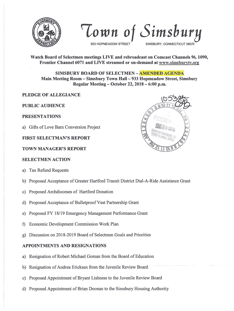 'Own of Sims bury 933 MEADOW STREETSIMSBURY, CONNECTICUT 06070Watch Board of Selectmen meetings LIVE and rebroadcast on Comcast Channels 96, 1090, Frontier Channel 6071 and LIVE streamed or on demand