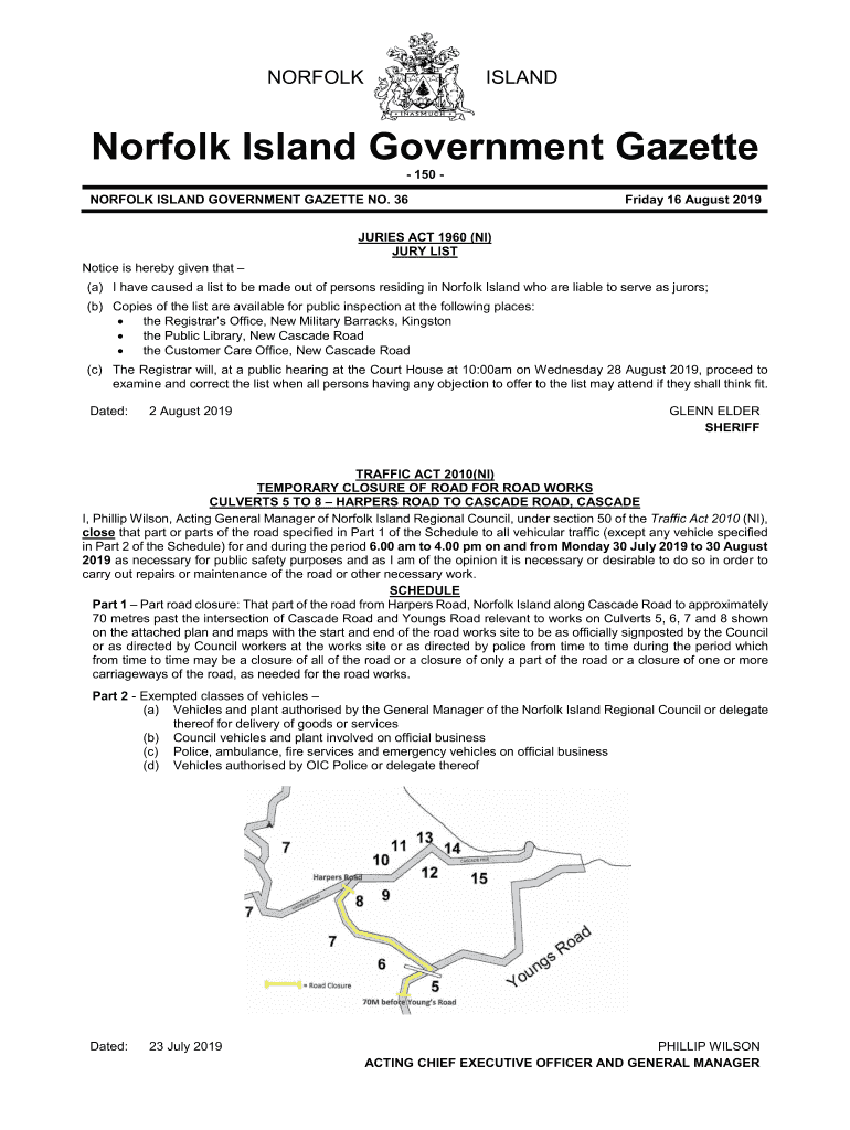 NORFOLKISLANDNorfolk Island Government Gazette 150 NORFOLK ISLAND GOVERNMENT GAZETTE NO. 36Notice is hereby given that Friday 16 August 2019JURIES ACT 1960 (NI) JURY LIST(a) I have caused a list to