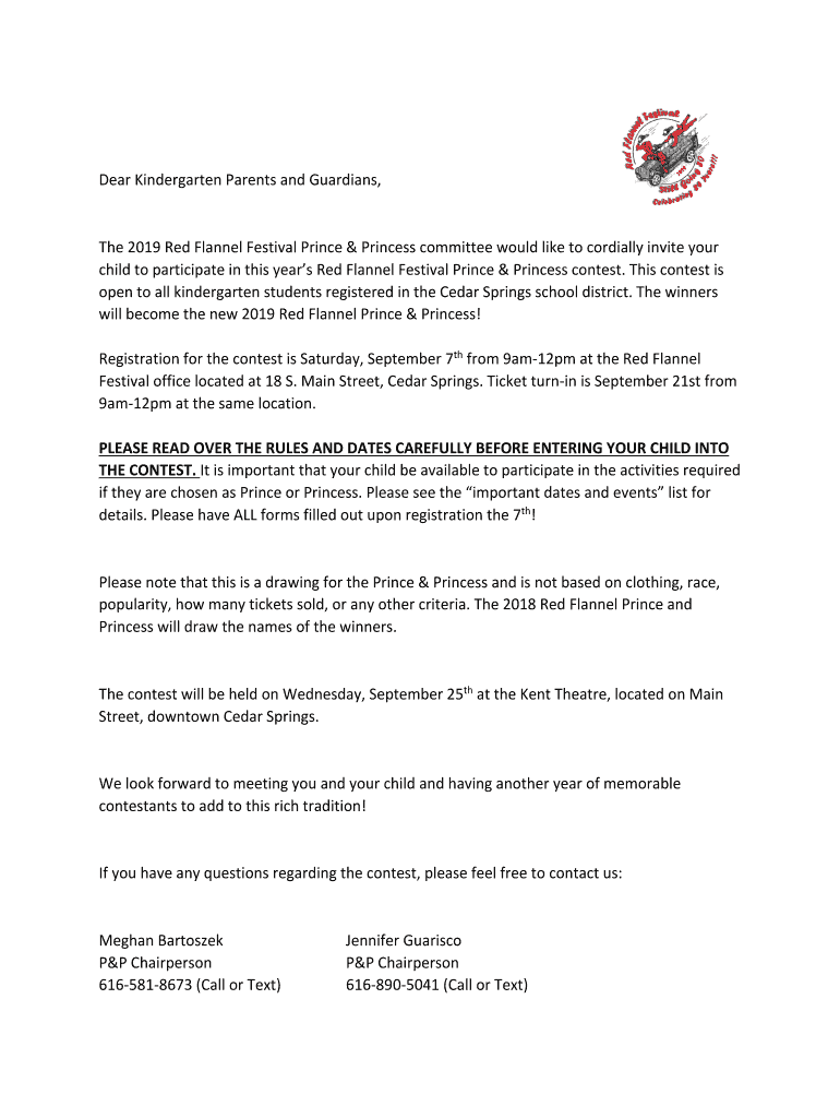 Dear Kindergarten Parents and Guardians, The 2019 Red Flannel Festival Prince & Princess committee would like to cordially invite your child to participate in this year's Red Flannel Festival Prince