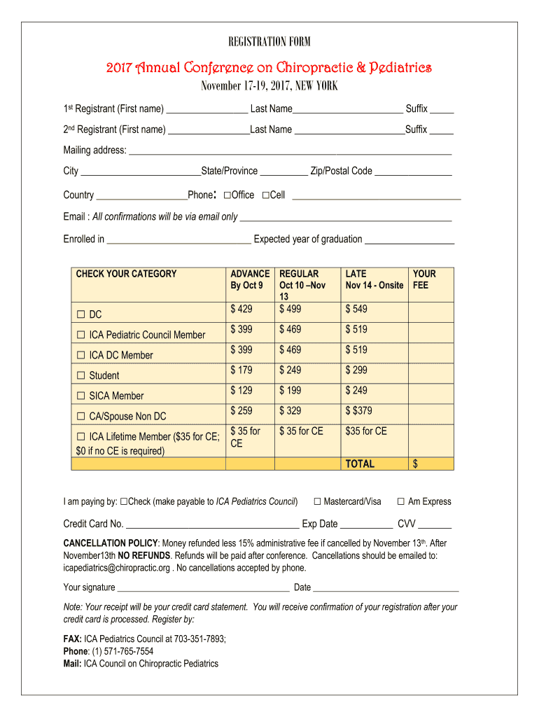 REGISTRATION FORM 2017 Annual Conference on Chiropractic & Pediatrics November 1719, 2017, NEW YORK 1st Registrant (First name) Last Name Suffix 2nd Registrant (First name) Last Name Suffix Mailing