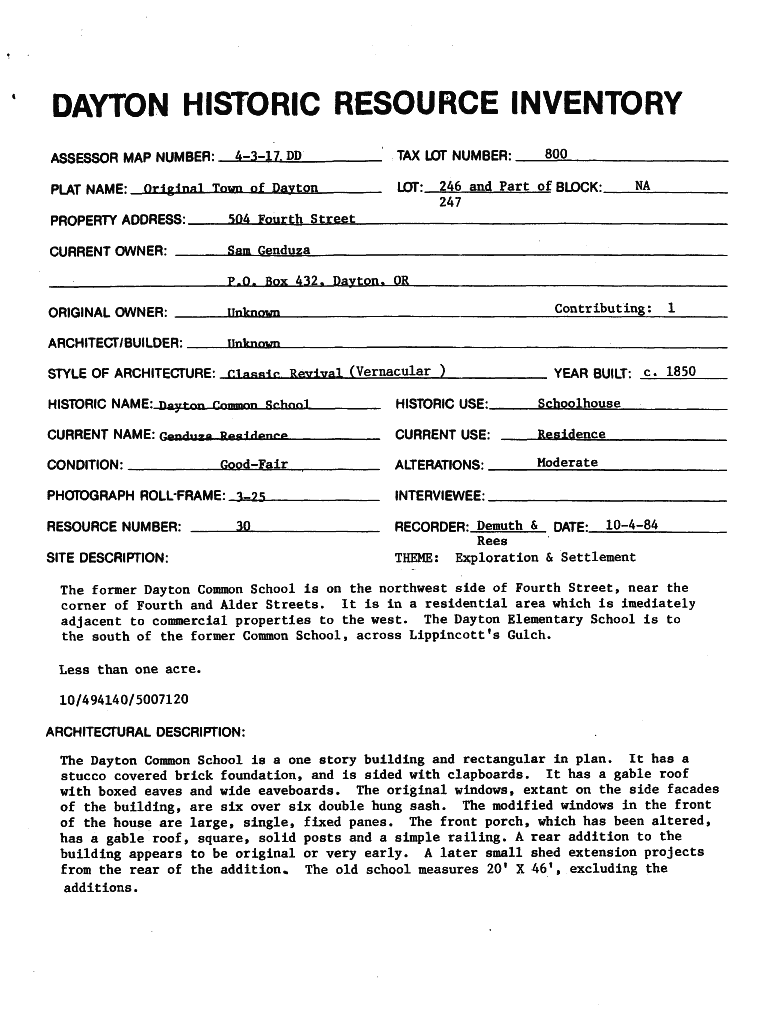 DAYTON HISTORIC RESOURCE INVENTORY ASSESSOR MAP NUMBER:PLAT NAME:4317. DP Original Town of Dalton PROPERTY ADDRESS:TAX LOT NUMBER:800 LOT:246 and Part of BLOCK: NA 247 504 Fourth Street CURRENT OWNER: