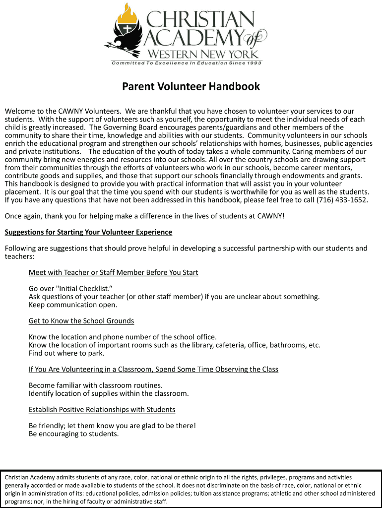 Get the free Parent Volunteer Handbook - Christian Academy of Western ...