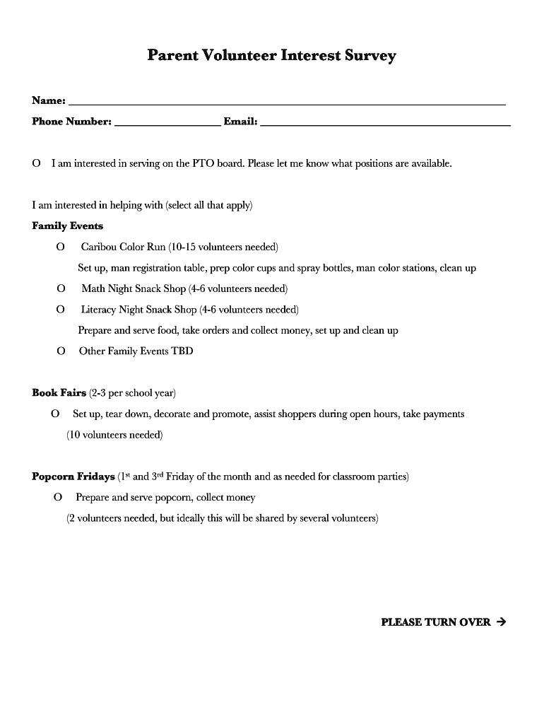Parent Volunteer Interest Survey Name: Phone Number: Email: OI am interested in serving on the PTO board. Please let me know what positions are available. I am interested in helping with (select all