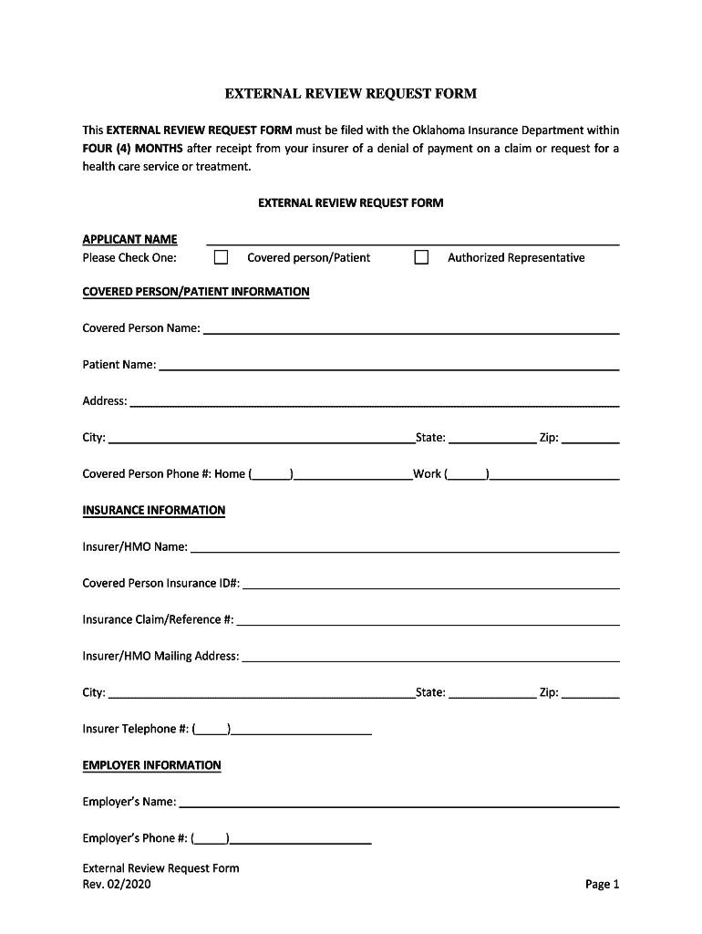 EXTERNAL REVIEW REQUEST From This EXTERNAL REVIEW REQUEST FORM must be filed with the Oklahoma Insurance Department within FOUR (4) MONTHS after receipt from your insurer of a denial of payment on