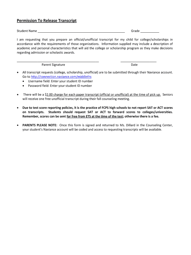 Permission To Release Transcript Student Name Grade I am requesting that you prepare an official/unofficial transcript for my child for college/scholarships in accordance with the requirements of