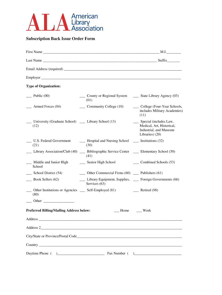 Subscription Back Issue Order Form First Name M.I. Last Name Suffix Email Address (required) Employer Type of Organization: Public (00) County or Regional System (01) State Library Agency (03) Armed