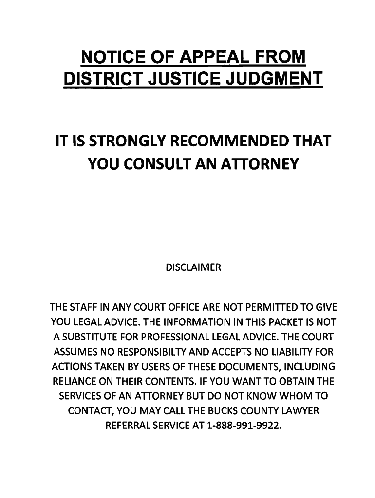 NOTICE OF APPEAL FROM DISTRICT JUSTICE JUDGMENT IT IS STRONGLY RECOMMENDED THAT YOU CONSULT AN ATTORNEYDISCLAIMERTHE STAFF IN ANY COURT OFFICE ARE NOT PERMITTED TO GIVE YOU LEGAL ADVICE. THE INFORMATION