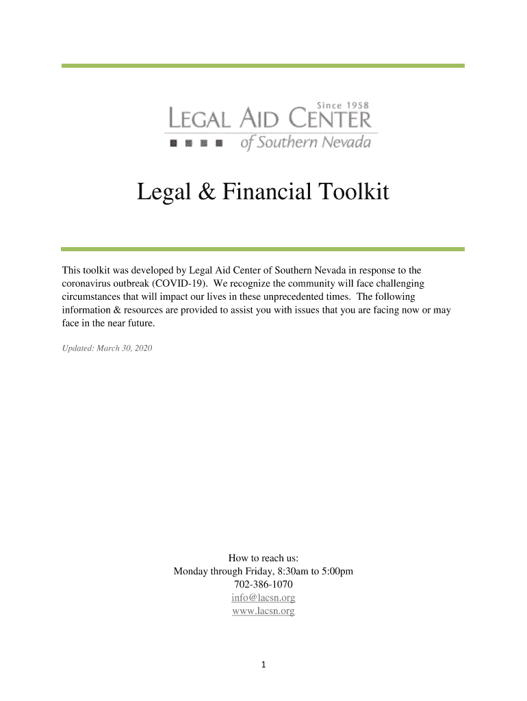 Legal & Financial Toolkit This toolkit was developed by Legal Aid Center of Southern Nevada in response to the coronavirus outbreak (COVID-19). We recognize the community will face challenging circumstances