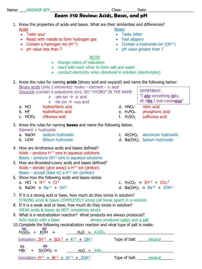 Name: ANSWER KEY Class: Date: Exam #10 Review: Acids, Bases, and pH 1. Know the properties of acids and bases. What are their similarities and differences? Acid Bases Taste sour Taste bitter React