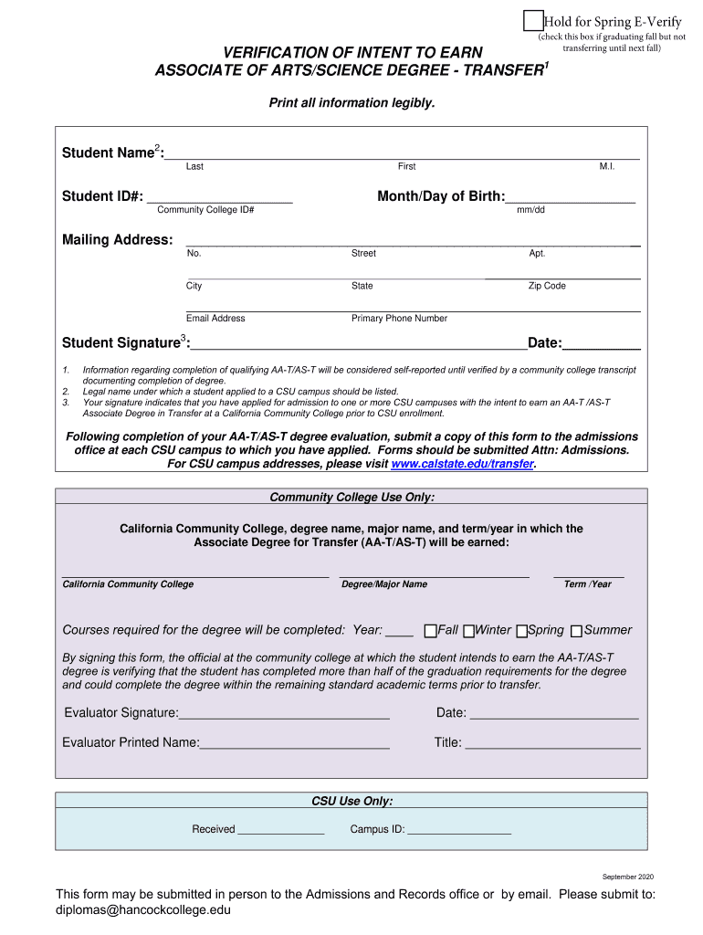 Hold for Spring Verify(check this box if graduating fall but not transferring until next fall)VERIFICATION OF INTENT TO EARN ASSOCIATE OF ARTS/SCIENCE DEGREE TRANSFER1 Print all information legibly.