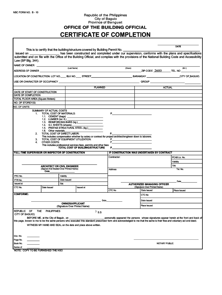 NBC FORM NO. B 10Republic of the Philippines City of Baguio Province of BenguetOFFICE OF THE BUILDING OFFICIALCERTIFICATE OF COMPLETION Dates is to certify that the building/structure covered by Building